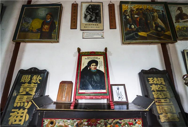塑像后面又是一棟房子,門首掛著“楊玉科將軍史料陳列展覽”的木匾,進(jìn)入屋內(nèi),正面靠墻壁擺著一張八仙桌,上面放著楊玉科遺照和家譜。遺照兩側(cè),橙底黑字,寫著“名垂青史音容在,功著神州德澤沈”幾個(gè)大字。八仙桌兩邊放著御賜的鍍金牌匾,左邊是“御欽黃馬褂”,右邊是“瑚松額巴圖魯”。